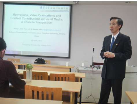 2012年4月20日上午,清华大学新闻学院党委书记金兼斌教授莅临浙江大学西溪校区,向传媒与国际文化学院师生深刻剖析了有关媒体时代内容贡献行为的激励机制问题。