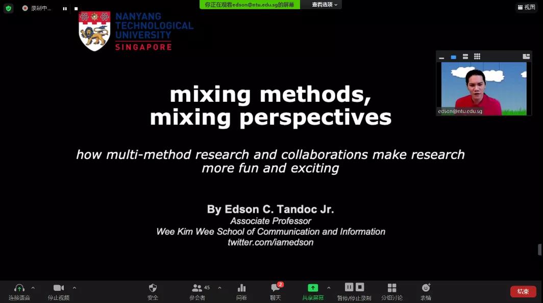 随后,南洋理工大学Edson Tandoc Jr.教授的学术报告带领同学们充分领略了多元方法研究的学术魅力,以其博士论文使用的研究方法为例,系统生动地介绍了如何运用多元的研究方法和视角来揭示传播学问题背后的本质,得出更可信的研究结论,提升研究的整体意义和价值。他还强调了合作研究的重要性,希望在未来的研究中同学们可以更频繁、更深入地进行学术交流与合作。