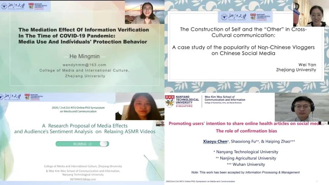 2020年10月16至17日,浙江大学传媒与国际文化学院和新加坡南洋理工大学黄金辉传播与信息学院共同举办线上博士生双边研讨会。两校博士生齐聚云端,聚焦“媒体与传播”专题,从不同学术视角和兴趣出发探讨当下热点传播问题。