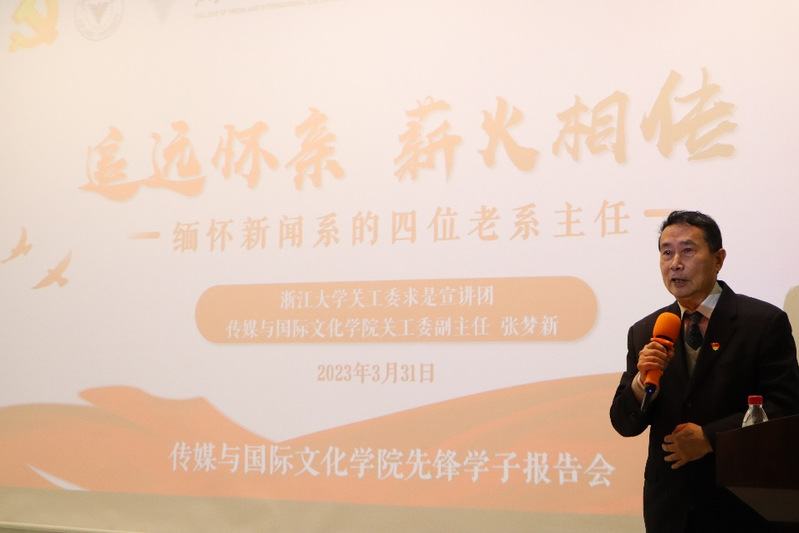 报告中,张梦新老师围绕人物生平、所获荣誉、社会评价等方面依次介绍了新闻系的四位老系主任:林淡秋、江牧岳、于光和张大芝,重点讲述了他们的求学经历、职业经历以及所作贡献。张梦新老师强调四位老系主任是传媒学院的开创者、发展者,强调他们对马列主义的坚定信仰,并通过竺可桢校长的经典两问、习近平总书记对浙大的指示精神以及党的二十大报告指出,传媒学院的先锋学子也要坚定信仰。