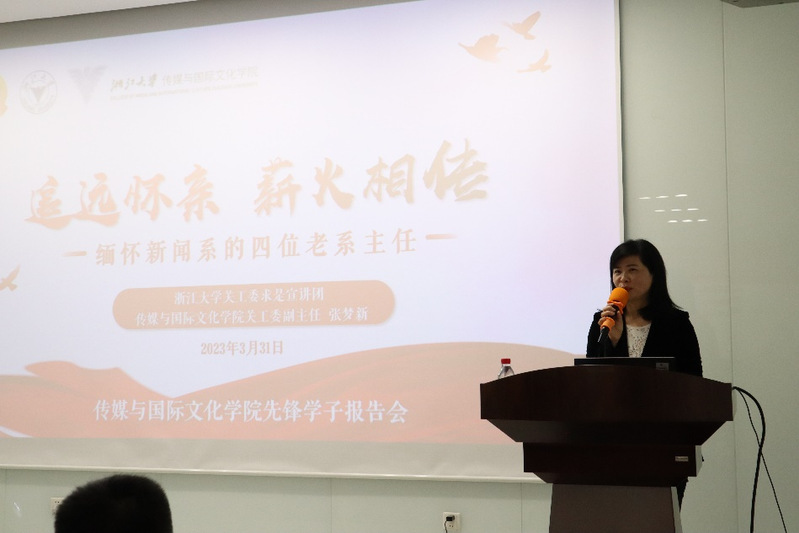 接着,张梦新老师引用唐代诗句“芳林新叶催陈叶,流水前波让后波”简要介绍了四位老系主任之后为新闻系作出贡献的部分老师们,并且提出希望,传媒学子们要怀抱理想、脚踏实地,敢想、敢为、善作善成,让青春在浙大建设中国特色一流大学的进程中留下无悔的奋斗痕迹!