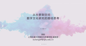 近日,由浙江大学公共外交与战略传播研究中心主办、浙江大学数字社会科学会聚研究计划协办的“数字新实践”系列活动第二期在线上成功举办。上海交通大学媒体与传播学院新闻与传播系副教授、数字平台与文化研究中心主任吴舫围绕媒介技术与文化之间的互动和自身经历,分享了“从社群到空间——数字文化研究的路径思考”。讲座由浙江大学公共外交与战略传播研究中心副主任、浙江大学传媒与国际文化学院百人计划研究员黄清主持,观众包括来自全国各高校的老师、同学,在线观看最高人次达166。