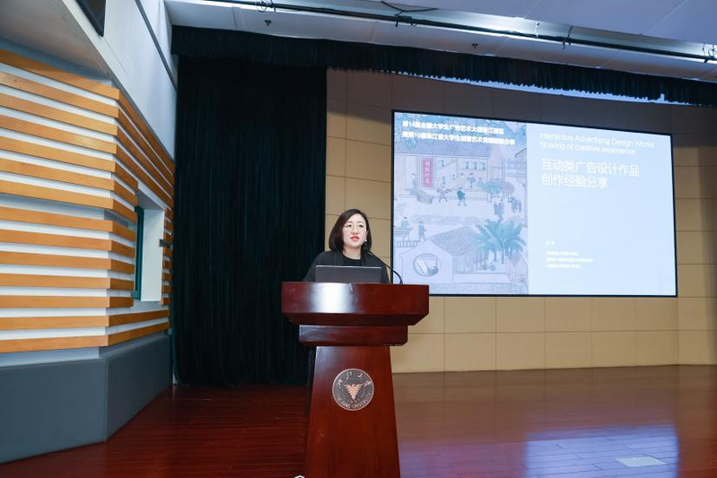 浙江大学传媒与国际文化学院策略传播系主任、大广赛浙江赛区组委会主任章燕老师在回顾了浙江赛区在去年取得的优异成绩后,分享了第14届大广赛的规则和注意事项,尤其是在“创意我百变”的赛事主题下,组委会会严查抄袭,尊重知识版权。同时,呼吁学生们继续创作出更好的作品。