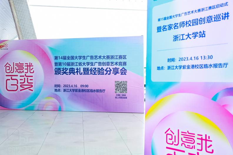 2023年4月16日上午9时,第14届全国大学生广告艺术大赛浙江赛区暨第10届浙江省大学生广告创意艺术竞赛颁奖典礼暨经验分享会在浙江大学紫金港校区临水报告厅隆重举行,本次活动由全国大学生广告艺术大赛组委会组织,大广赛浙江赛区组委会主办,浙江大学传媒与国际文化学院承办。本次活动主要分四个单元,分别是领导致辞、颁奖典礼、调研报告发布、优秀指导教师经验分享等。