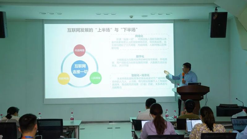 讲座伊始,喻教授首先提出政府规制、市场产业、技术革命和社会安全四大影响中国传媒业发展的基本维度,并就各个维度进行分析解读,指出互联网发展是通过“连接一切”的方式来激活、整合、融合“微资源”,其本质是对于个性化需求的满足并从中获利以开拓全新的市场蓝海。就技术而言,改良型的技术将引发结构要素、作用机制、运作逻辑的完善与调试,而革命性的技术会导致发展目标、基本构造、运作逻辑的根本性再造;目前正在发力的AIGC作为一种革命性技术,将推动整个社会的媒介化过程。