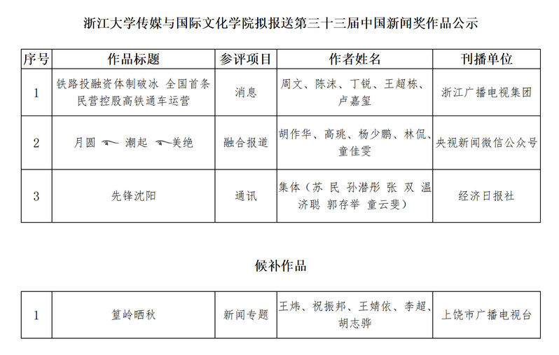 现予以公示5个工作日,公示日期为2023年5月18日至5月25日。欢迎社会各界监督、评议,如有意见,可向浙江大学传媒与国际文化学院反映。