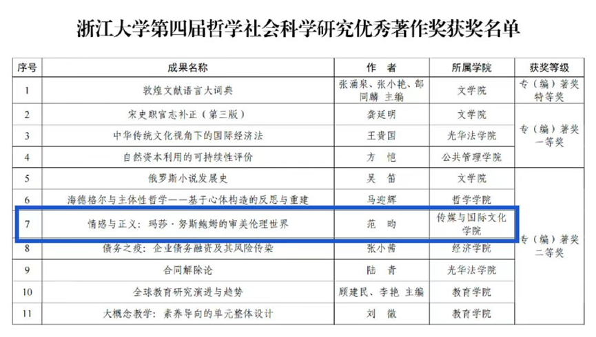 近日,经学院(系)推荐、校内外专家评审、浙江大学文科发展领导小组审定通过和网上公示,共有21项成果获得浙江大学第四届哲学社会科学研究优秀著作奖,其中我院范昀教授的著作《情感与正义:玛莎·努斯鲍姆的审美伦理世界》获得二等奖。