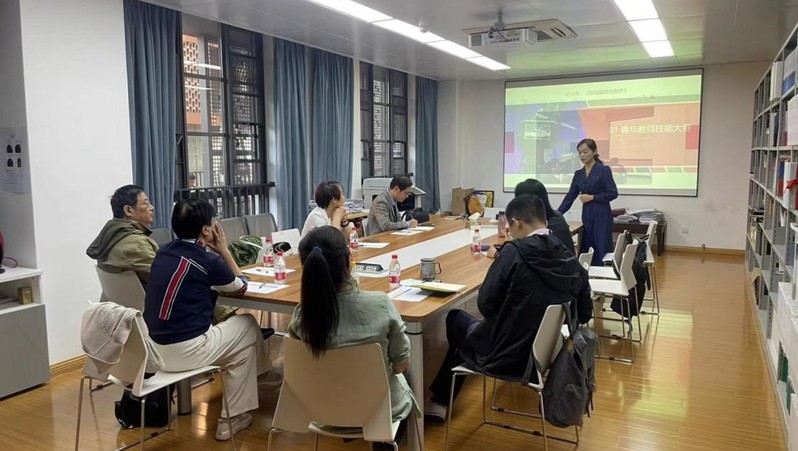 传媒与国际文化学院特聘副研究员张佳峰进行了“初发芙蓉与错彩镂金”的课程试讲,随后,刘翔、陆建平、吴赟、章燕等诸位老师围绕课件设计、课程导入、授课节奏和师生互动等教学方面予以点评和指导。