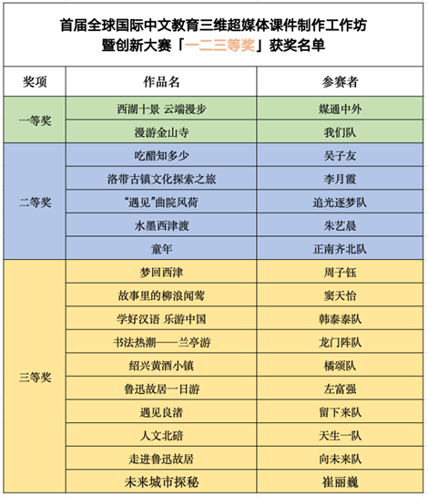 2023年10月31日,由江苏大学文学院(语言文化中心)主办的首届“全球国际中文教育三维超媒体课件制作工作坊暨创新大赛“公布获奖名单,浙江大学汉硕研究生组织的两支参赛队伍均获得奖项, “媒通中外”队凭借作品《西湖十景 云端漫步》荣获一等奖, “韩泰泰”队凭借作品《学好汉语 乐游中国》荣获三等奖。