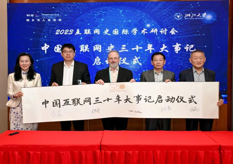 在中国互联网30年大事记启动仪式上,与会嘉宾中国互联网协会副理事长、中国IGF主任黄澄清,中国互联网协会互联网治理工作委员会常务副主任、联合国互联网治理论坛多利益相关方咨询委员会委员、中国IGF常务副主任、中国互联网络信息中心副主任张晓,硅谷计算机历史博物馆互联网历史项目策展总监马克·韦伯,清华大学电子工程系教授、CERNET网络中心副主任李星,浙江大学求是特聘教授、乌镇数字文明研究院院长方兴东共同为项目揭牌。