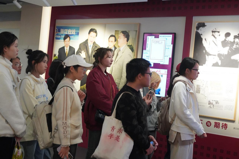 接下来,同学们又来到了浙江日报社社史馆。习近平总书记的新闻思想在该馆得到了保留和呈现,中国特色社会主义新闻事业发展之路的一个代表被浓缩在了这座报社史馆中。在讲解员爷爷的带领下,同学们依次参观了习近平总书记为浙江日报社创刊七十周年发来的贺信、浙江日报社历年来的优秀报道、优秀记者、各子平台。展馆内陈列的不同年代的陈旧相机和创刊时的办公室旧址还原场景也深深地吸引了同学们的注意力,引发了各传媒学子的思考。总书记对浙江日报社的关注,也反映了新时代传媒事业发展的重要性。