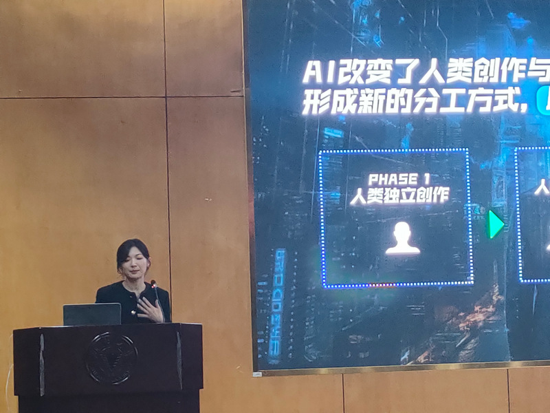 蓝色光标作为一家致力于在大数据和社交网络时代为企业智慧经营全面赋能的科技营销公司,为同学们带来了AI广告营销的创意实践分享。蓝色光标数字营销机构品牌中心负责人阎钦先生以「“X”Creative」为主题,提出“AI不仅是工具,更是互动的平台”的观点。阎钦先生指出,AI作为帮助实现人文关怀的桥梁,可以激发个体潜能,帮助任何人成为艺术家。蓝标传媒华东AIGC总监房润嘉女士以「创意超级物种联盟」为主题,进一步对AIGC赋能创作展开分享。房润嘉女士指出当前时代技术飞速发展,AI一日,人间一年;并提出了“AI+创意=超级物种”这一创意公式。房润嘉女士认为,使用AI创作时,我们应该找到创作的初心与创意出发点。只有打破固有认知,用创意为AI赋能,找到更多可能性,才能成为新时代的“超级物种”。