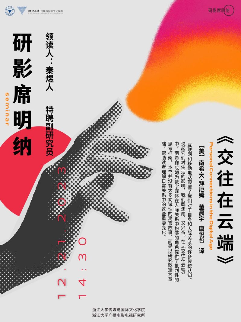 12月21日下午,第六期研影席明纳在浙江大学紫金港校区西区传媒与国际文化学院614教室成功举行。浙江大学传媒与国际文化学院特聘副研究员秦煜人老师作为领读人,为大家带来《交往在云端:数字时代的人际关系》的深度解读,带领同学们一同踏上这场关于云端交往的探索之旅。
