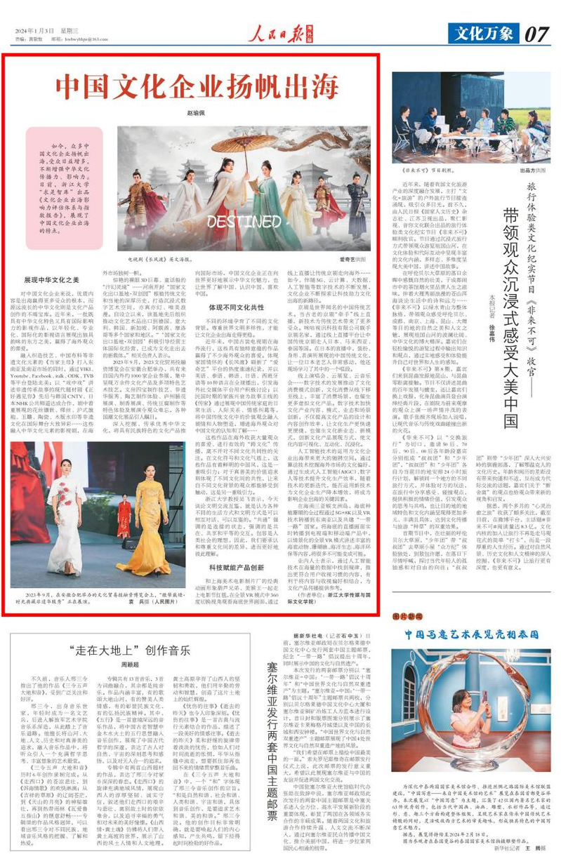 202413日,《人民日报·海外版》《CGTN》刊发了我院赵瑜佩老师题为《中国文化企业扬帆出海》的文章。