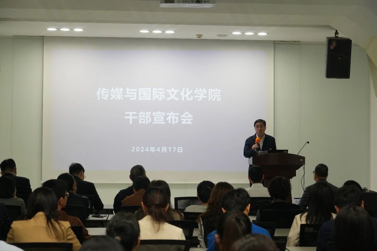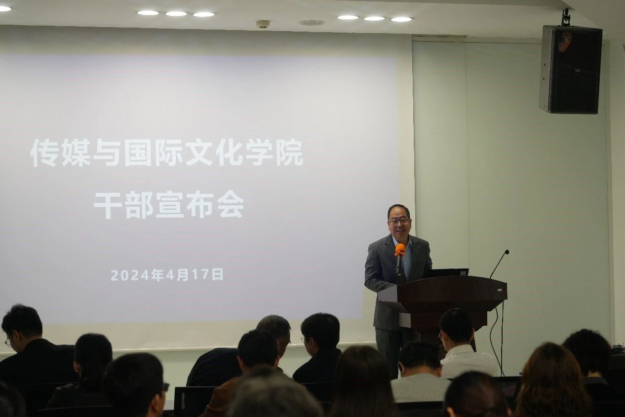 校党委组织部副部长夏雷宣读学校党委行政关于传媒与国际文化学院领导干部的任免决定文件,宣布方兴东任传媒与国际文化学院常务副院长;免去韦路的传媒与国际文化学院院长、党委副书记、委员职务。