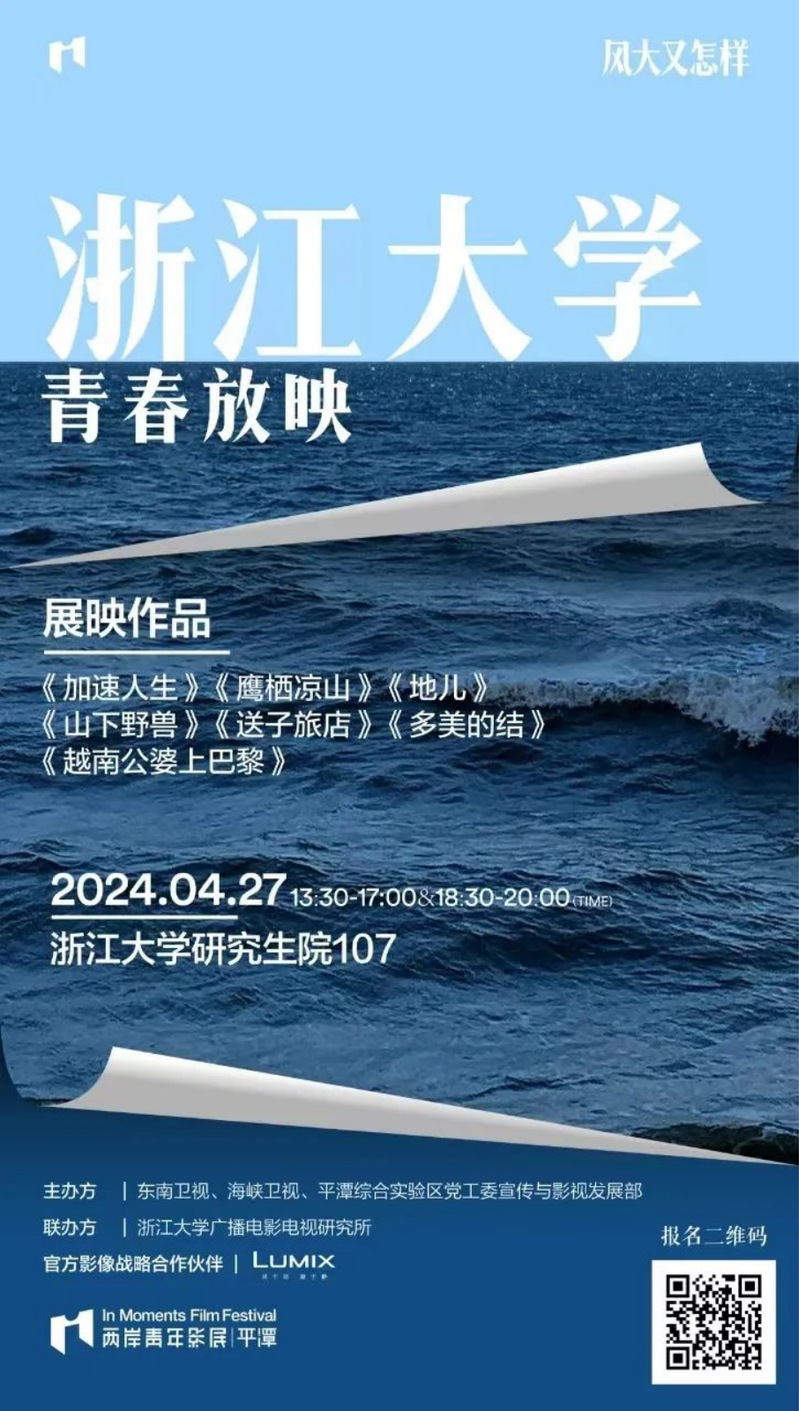 4月27日下午13:30,IM两岸青年影展将携手浙江大学广播电影电视研究所、浙江大学电影协会,在浙江大学研究生院107开展2024年度的青春放映活动。