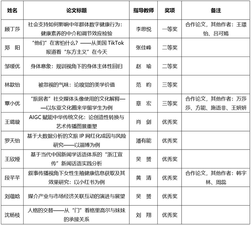 经学生自主投稿、评委评审,传媒与国际文化学院首届“望道”学生学术论文报告会共评选出获奖论文22篇,其中一、二、三等奖10篇,优秀奖12篇。获奖名单如下: