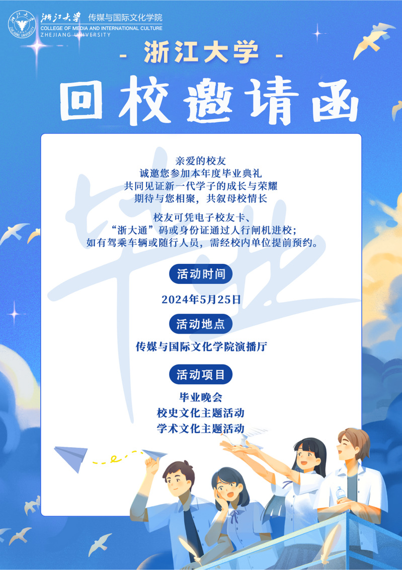 傍钱江潮涌,浙大恒立,智慧闪耀百年路。岁月如梭,荣光日新,2024年5月21日,我们将喜迎浙江大学127载华诞。值此校庆之际,传媒与国际文化学院诚邀各位校友回到母校,参加本年度毕业典礼,共同见证新一代学子的成长与荣耀。请您带上满满的回忆,踏上归程,与我们一起,在这个特别的日子里,共同书写华章。期待与您相聚,共叙母校情长!