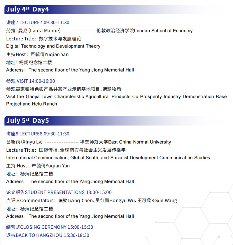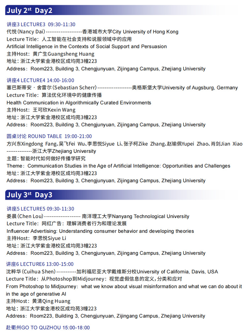 自2004年起,浙江大学传媒与国际文化学院已连续举办十五期“国际前沿传播理论与研究方法”高级研修班。研修班最初由浙江大学吴飞教授、威斯康星大学潘忠党教授、宾夕法尼亚大学杨国斌教授联合发起,通过采取海内外名校教授授课、主题互动以及论文研讨相结合的形式,旨在深入探讨国际传播学界所面临的重大问题,推动相关研究领域的理论和方法创新,共同应对全球变局的挑战。今年首次与清华大学、浙江省衢州市衢江区人民政府合作,聚焦人工智能时代为传播学研究与实践带来的机遇和挑战,开展研讨交流。