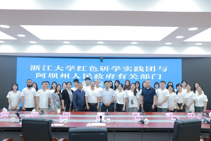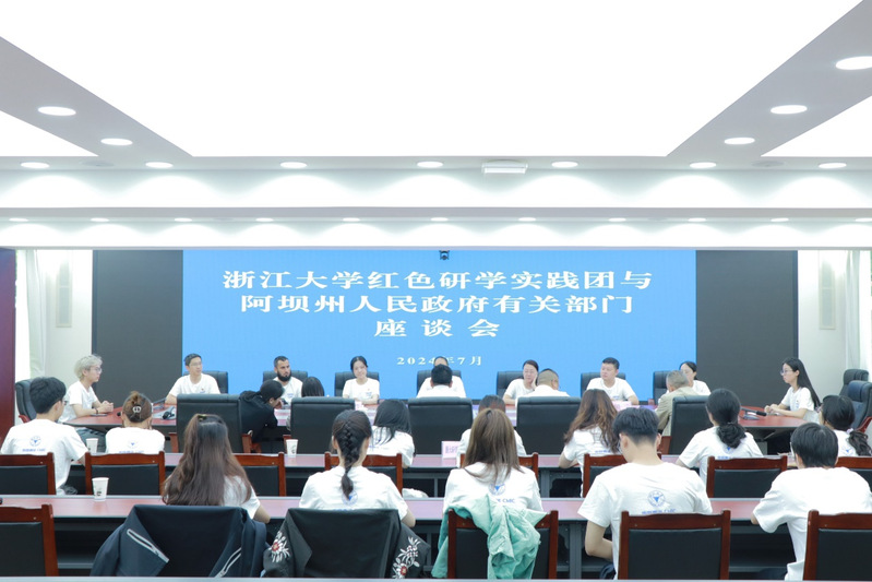 7月21日,浙江大学传媒与国际文化学院“重走长征路”党性教育培训红色研学团、赴四川省阿坝藏族羌族自治州“长征精神薪火相传,传媒理想生生不息”暑期社会实践团同阿坝藏族羌族自治州人民政府召开座谈会,就东西协作、山海互助、探索研学实践课程新路径、如何深入挖掘当地红色、绿色等旅游禀赋、推进城市文化传播与宣传体系建设等方面展开深入交流,就实现校地双方优势互补,山海协作等方面进行亲切交谈。