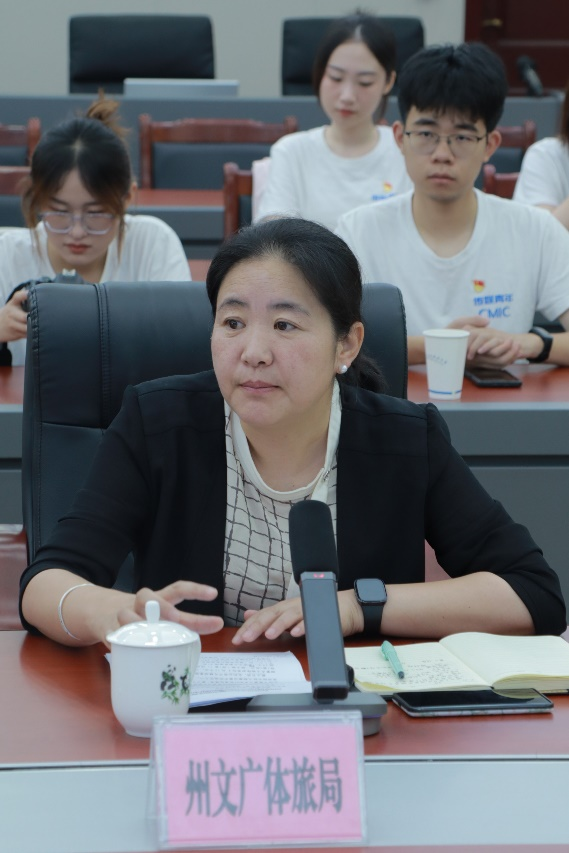 浙江大学传媒与国际文化学院党委书记王庆文及学院师生代表一行与阿坝藏族羌族自治州政府副秘书长陈磊,州委教育工委书记、州教育局党委书记、局长东周,州文广体旅局党组成员、副局长张燕,州新闻传媒中心党委副书记、主任刘树刚,州委宣传部四级调研员、宣教科科长严友华参加本次座谈会。州政府副秘书长陈磊主持座谈会。