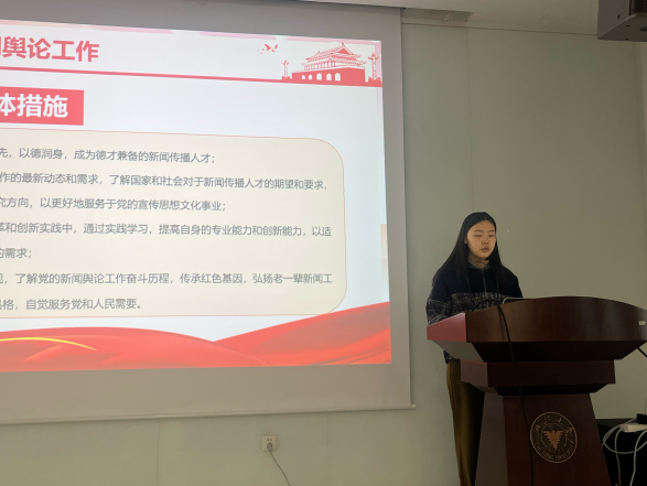 在回信中,习近平总书记强调了高校应当“落实立德树人根本任务,聚焦新闻舆论工作需要,突出办学特色,深化改革创新,不断提高教学科研水平,努力培养更多高素质新闻传播人才,为党的宣传思想文化事业发展作出新的贡献。”。这一番话不但为传媒高校指明办学方向,而且立下了新目标,注入了新动力。身为预备党员的传媒学子,深入学习领会并对学校、学院的教学理念和方法积极献言建策。袁茂文小组着眼当下,认为学院应当紧密结合行业特色,提出了优化课程体系和加强实践教学平台建设等可行措施。姚雪芹小组则放眼未来,指出在信息化、全球化的浪潮下,未来的传媒人才需要具备较强的跨学科能力,能够应对多变的媒体环境,办学部门不仅应当丰富教育内容,鼓励学生掌握更多的技术手段,也需要把国际化的教学资源“引进来”,把传媒师生“送出去”。薛邡曰小组聚焦“如何做好新闻舆论工作”,提出要将马克思主义新闻观融入新闻传播教育的全过程,培养学生坚定的爱国情怀和社会责任感,使之成为具有坚定政治立场和良好新闻素养的新闻人才,为提升主流媒体新闻舆论“四力”输送关键人才。
