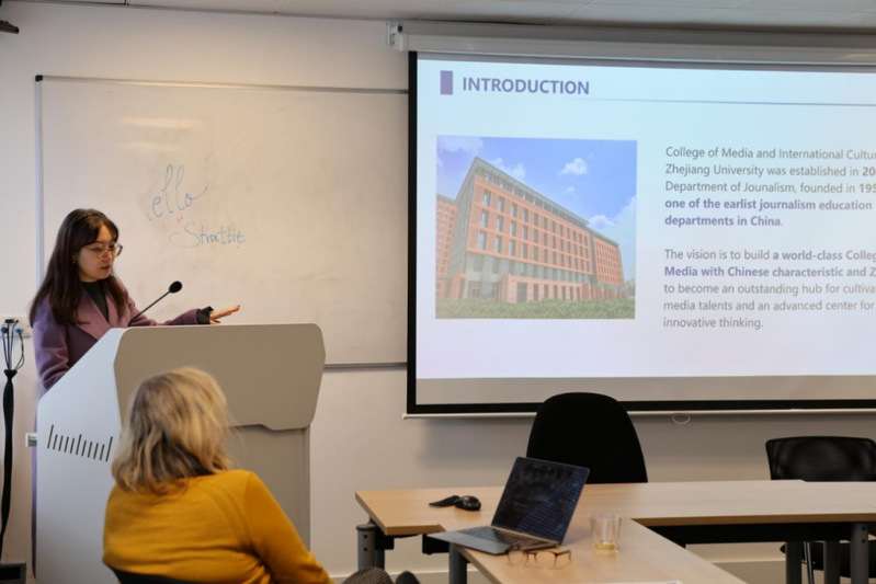 LSE方参与会谈的教授有全球传播著名学者Terhi Rantanen,系主任Maria Georgiou,以及LSE博士生学术委员会主任孟冰纯。我院副教授、博士生导师、全球传播博士生项目主任章宏在交流中介绍了学院的学科特色,强调学院以“全球视野、交叉创新”为核心理念,致力于培养具有国际竞争力的复合型传播人才。
