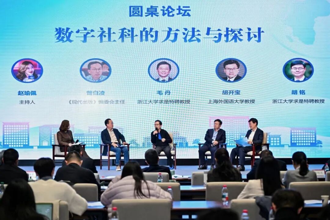 《现代出版》编委会主任曾白凌、上海外国语大学教授胡开宝、浙江大学求是特聘教授胡铭、浙江大学求是特聘教授毛丹参与圆桌论坛讨论。