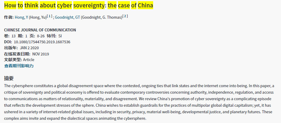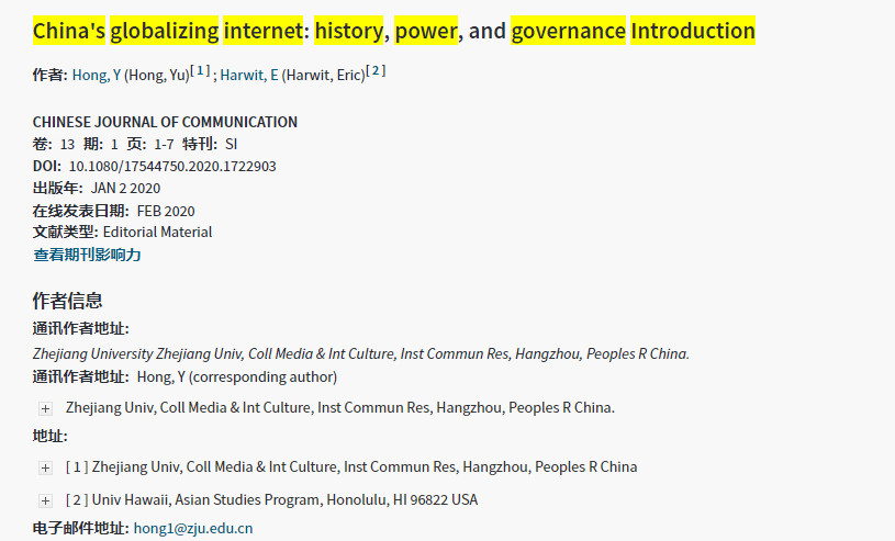 2020-09-02 《CHINESE JOURNAL OF COMMUNICATION 》洪宇、Harwit, EricChina's globalizing internet: history, power, and governance Introduction 更多