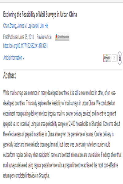 2017-11-01 《FIELD METHODS》 张婵; Lepkowski, James M.; He, LiruiWhile mail surveys are common in many developed countries, it is still a new method in other, often less-developed countries. This study explores the feasibility of mail surveys in urban China. We conducted an experiment manipulating delivery method (regular mail vs. courier delivery service) and incentive payment (prepaid vs. no incentiv 更多