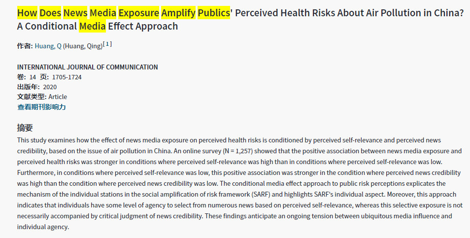 2020-09-02 《INTERNATIONAL JOURNAL OF COMMUNICATION 》黄清This study examines how the effect of news media exposure on perceived health risks is conditioned by perceived self-relevance and perceived news credibility, based on the issue of air pollution in China. An online survey (N = 1,257) showed that the positive association between news media exposure and perceived health risks was stronger in conditions where perceived self-relevance was high than in conditions where perceived self-relevance was low. Furthermore, in conditions where perceived self- 更多 -