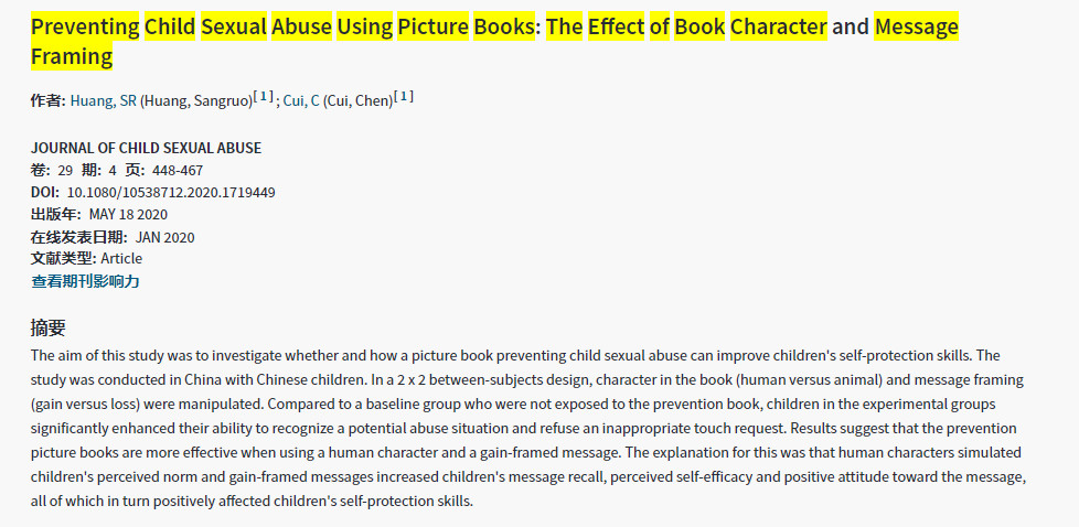 2020-09-02 《JOURNAL OF CHILD SEXUAL ABUSE》黄桑若、崔晨The aim of this study was to investigate whether and how a picture book preventing child sexual abuse can improve children's self-protection skills. The study was conducted in China with Chinese children. In a 2 x 2 between-subjects design, character in the book (human versus animal) and message framing (gain versus loss) were manipulated. Compared to a baseline group who were not exposed to the prevention book, children in the experimental groups significantly enhanced their ability to recogniz 更多 -