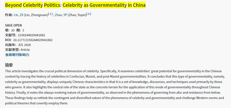2020-09-02 《SAGE OPEN 》林仲轩,赵瑜珮This article investigates the crucial political dimension of celebrity. Specifically, it examines celebrities' great potential for governmentality in the Chinese context by tracing the history of celebrities in Confucian, Maoist, and post-Maoist governmentalities. It concludes that this type of governmentality, namely, celebrity as governmentality, displays uniquely Chinese characteristics in that it is a set of knowledge, discourses, and techniques used primarily by those who govern. It also hi 更多 -