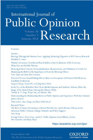 2018-07-24 《INTERNATIONAL JOURNAL OF PUBLIC OPINION RESEARCH》 Timothy K F Fung 闫文捷 Heather AkinThis study presents a theoretical framework that examines foreign publics’ use of foreign news from domestic media and preexisting schema to form an image of another nation. To test the proposed theoretical framework, we examined Chinese citizens’ image of the United States using the data from a survey collected from a representative samp 更多