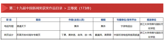 The 29th China Journalism Award, sponsored by All-China Journalists Association, presented two third-prize winners recommended by College of Media and International Culture at Zhejiang University. The two works are Thematic Web Page onthe 40th Anniversary of Reform and Opening up by the Russian Channel of China Global Television Network, and From Ningbo to the Globe by Ningbo Television Station.