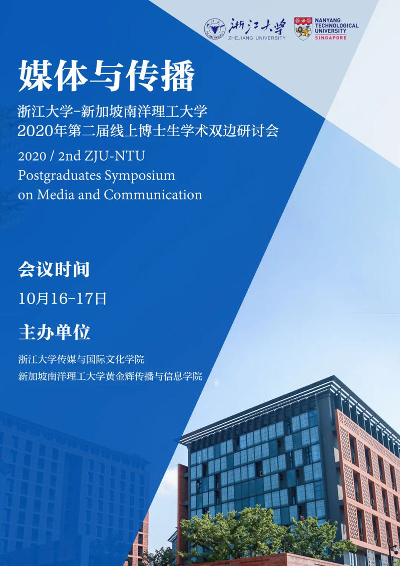 HANGZHOU—On October 16 and 17, the College of Media and International Culture (CMIC) of Zhejiang University and the Wee Kim Wee School of Communication and Information (WKWSCI) of Nanyang Technological University (NTU) will jointly organize the 2020 PhD Symposium online. The symposium is themed “Media and Communication” in which doctoral students from both universities will discuss the dissemination of the latest topics from different academic perspectives.