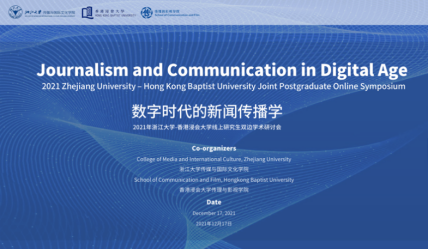 HANGZHOU—The 2021 Zhejiang University-Hong Kong Baptist University Joint Postgraduate Online Symposium was held on December 17. Themed “Journalism and Communication in the Digital Era”, the event was a joint effort of the College of Media and International Culture (CMIC) of Zhejiang University and the School of Communication and Film, Hong Kong Baptist University. Prof. Huang Yu, dean of the School of Communication and Film, Prof. Wei Lu, dean of CMIC, Prof. Zhao Yu, associate dean of CMIC, together with other scholars like Prof. Song Yunya, Dr. Vincent Huang, Dr. Angela Wang Dan, Dr. Yan Yuqian, Dr. Huang Guangsheng, and Dr. Ji Yingru participated in this online symposium.