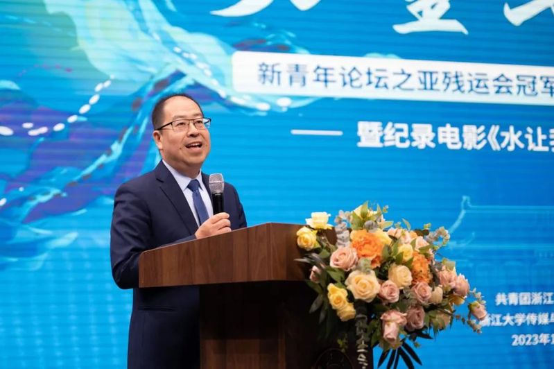 The event was presided over by Zhao Wei, torch bearer and volunteer of Asian Para Games, and commenced with a welcome speech delivered by Wang Qingwen, Secretary of CMIC Party Committee. Wang noted that ZJU highly values the cause of the disabled, establishing relevant research centers combined with barrier-free organizations and arousing students’ concerns for the disabled. He also acknowledged the distinguished work of over 600 ZJU volunteers in Asian Para Games and praised the documentary film Above Water for showcasing spirits of sports and perseverance of athletes. Lastly, he saluted those who strive for their athletic dreams and who contribute to the cause of the disabled, and conveyed best wishes for this event.