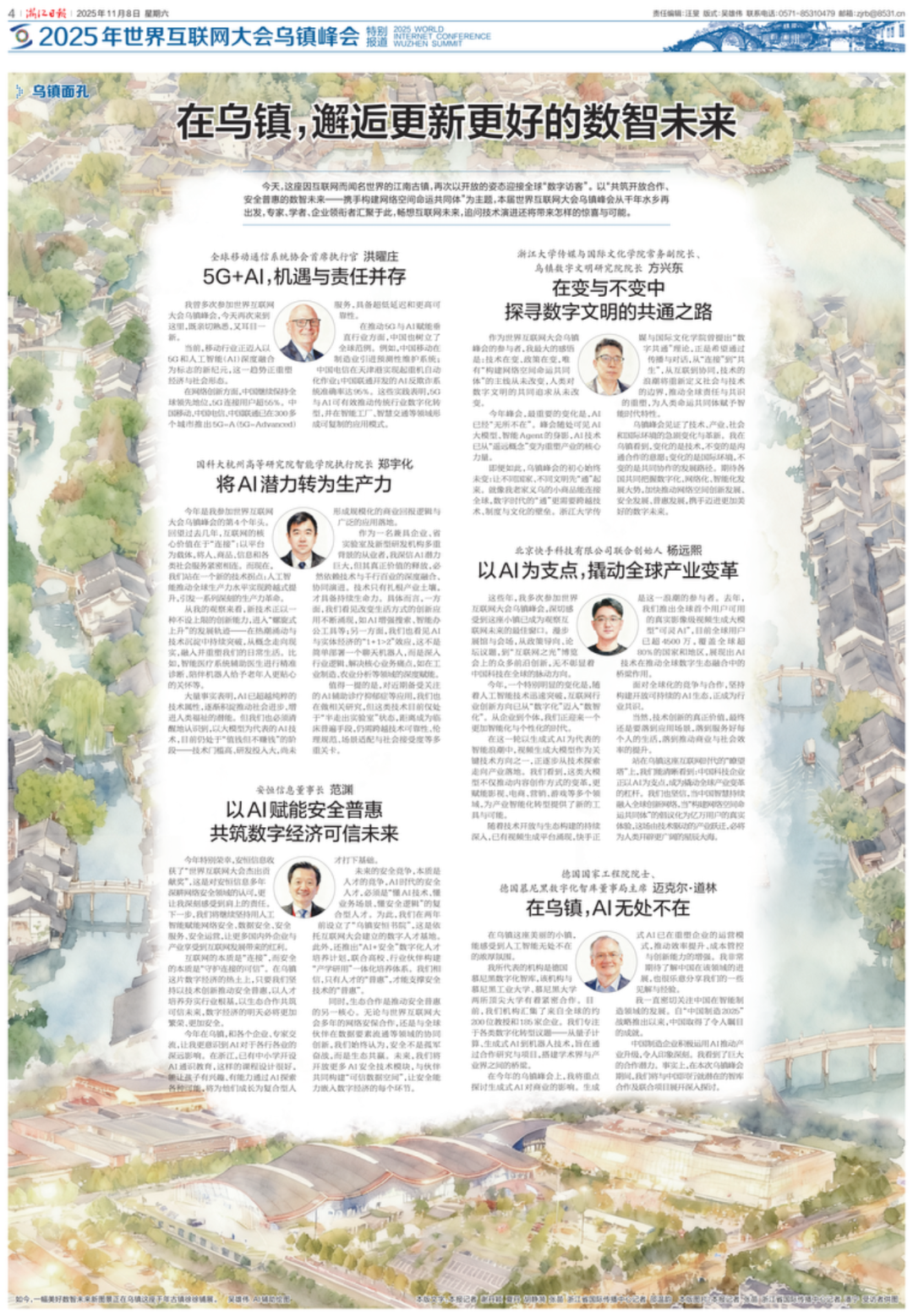 "Technology evolves, policies shift, yet the central tenet of 'building a community with a shared future in cyberspace' remains constant." " During the 2025 World Internet Conference Wuzhen Summit, the remarks of Fang Xingdong, Executive Vice President of the School, were featured in the Zhejiang Daily. Throughout the summit, the School not only actively participated in global digital governance discussions through co-organising the "Witnessing Digital Civilisation in Tongxiang" series of Wuzhen Café gatherings, but also contributed Zhejiang's wisdom and Zhejiang University's solutions to global cyberspace development through its "Digital Commonality" theory.